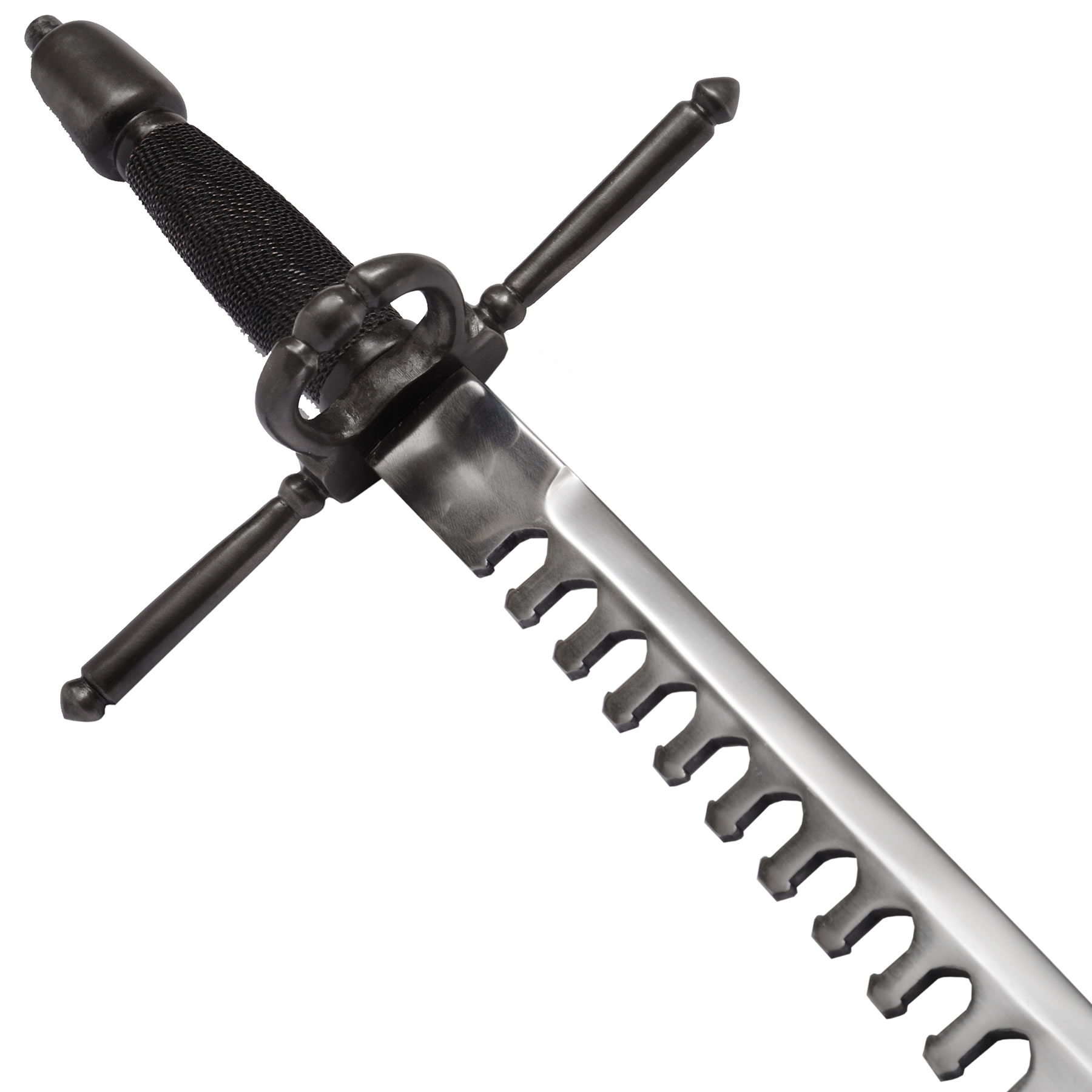 Here comes the second. A rapier, 40 inches long, which is relatively lightweight. Useful for 1v1 duels due to the so-called cup hilt that guards the merc's hand, and it's mainly suited for thrusting (duh) unlike everything else in his arsenal. Accompanied by a parrying dagger known as a swordbreaker which is used to intercept attacks and create openings. The dagger cannot be used to deal any significant damage if it's used to attack a foe. Unfortunately, the rapier's quick but rather weak, and while it's great for outlasting or stalling an opponent in a swordfight, neither the hilt nor the dagger will help much if the opponent's using magic or guns.